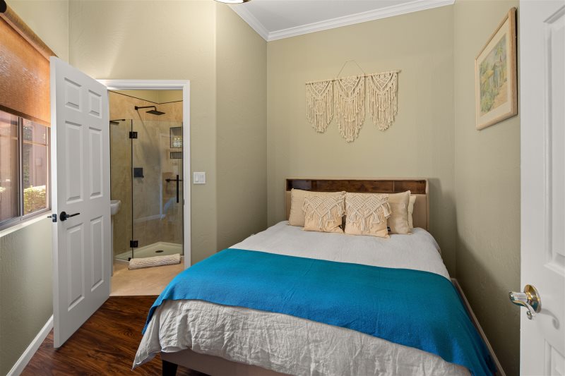 With two well-appointed bedrooms and two full bathrooms, Desert Poppy comfortably accommodates up to four guests. The primary suite just off the dining area features a plush queen bed and an ensuite bathroom with a walk-in shower. The second bedroom - bright and inviting - also features a queen bed and overlooks the private patio for peaceful mornings. A shared guest bathroom with a walk-in shower makes freshening