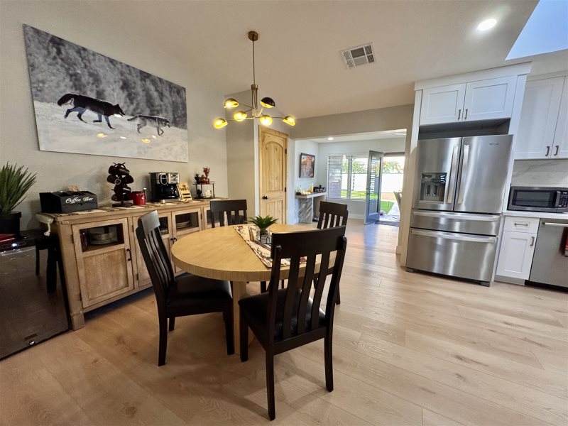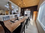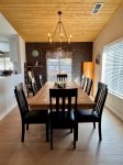 The house features a spacious great room with tongue and groove ceilings, warm LVP floors, contemporary furnishings, luxury reclining couch, a smart TV for streaming, a cozy electric fireplace for heat and ambiance (multiple unique, alluring settings). The chef in the family will love the high-end kitchen fully equipped with modern stainless steel appliances, Bluetooth oven, large quartz counters with bar top seating, and an adjoining formal dining area with a beautiful wooden table for family mealtimes and game nights. The breakfast nook offers a wine fridge, and console stocked with a coffee and tea assortment and essentials for your enjoyment!