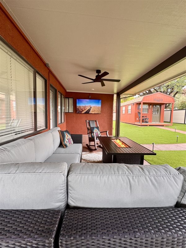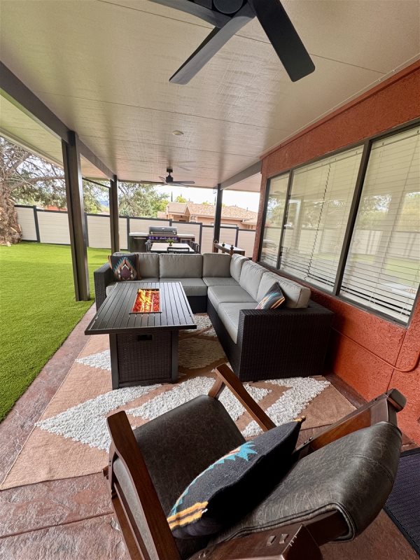 Outdoor: 2 Separate Patios: Front Patio with Seating, Covered Back Patio with Propane Firetable, Propane BBQ Grill, Wine Fridge, Large 65" Smart Flat Screen TV, Outdoor Seating, Stunning Scenic Red Rock Views, Fully Fenced Yard with Privacy Fence, Astroturf, and Cornhole Game. **Note the backyard She-Shed is not for use/locked off**