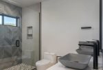 The second primary suite features a Posturoedic king bed and full bath with a large spa soaking tub and walk-in shower.