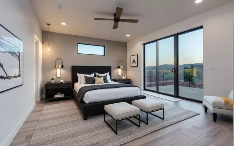 The main primary suite is a sanctuary of its own, complete with a "Purple Mattress" king bed and spa-like ensuite bathroom with a walk-in shower, double vanities, and direct access to the front landscape view outdoor patio.